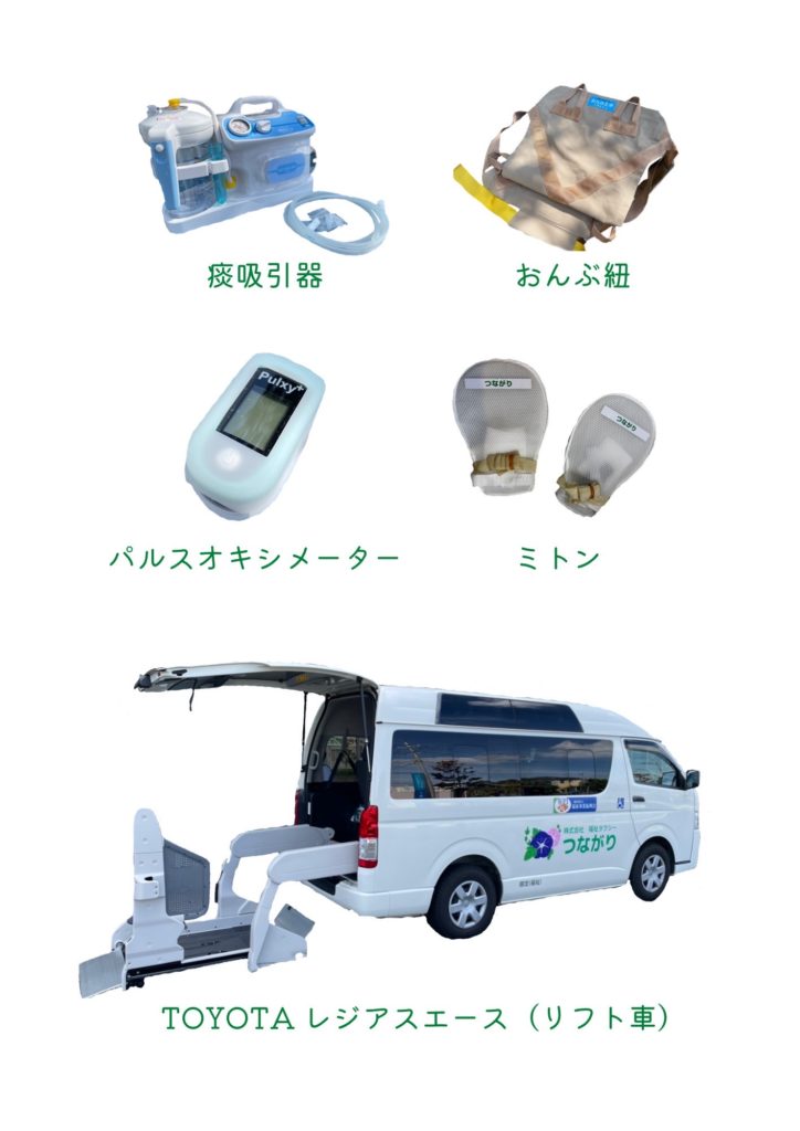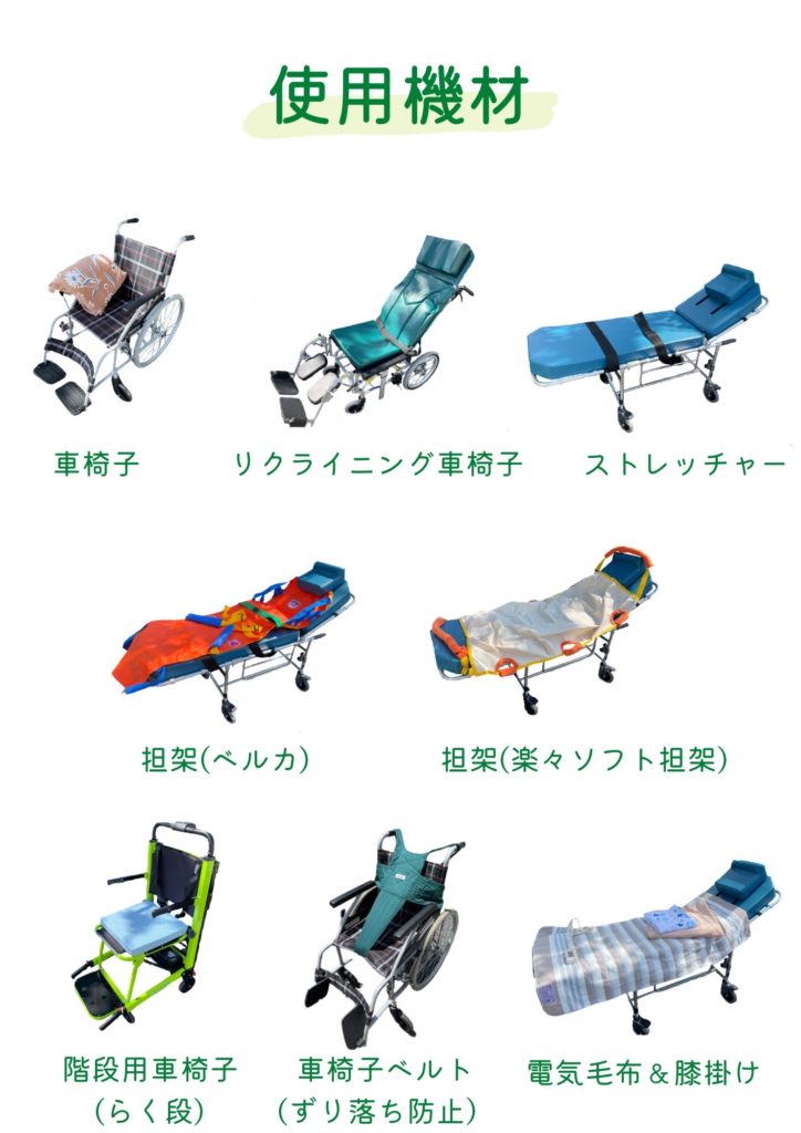 使用機材 ※ご家族様のサポートがあれば、電動車イスで階段を移動することが可能です。※方向転換が必要な階段を上り下りする場合は、車イスの旋回スペース(踊り場など)が、奥行き110cm × 横幅210cm以上あることが好ましいです。